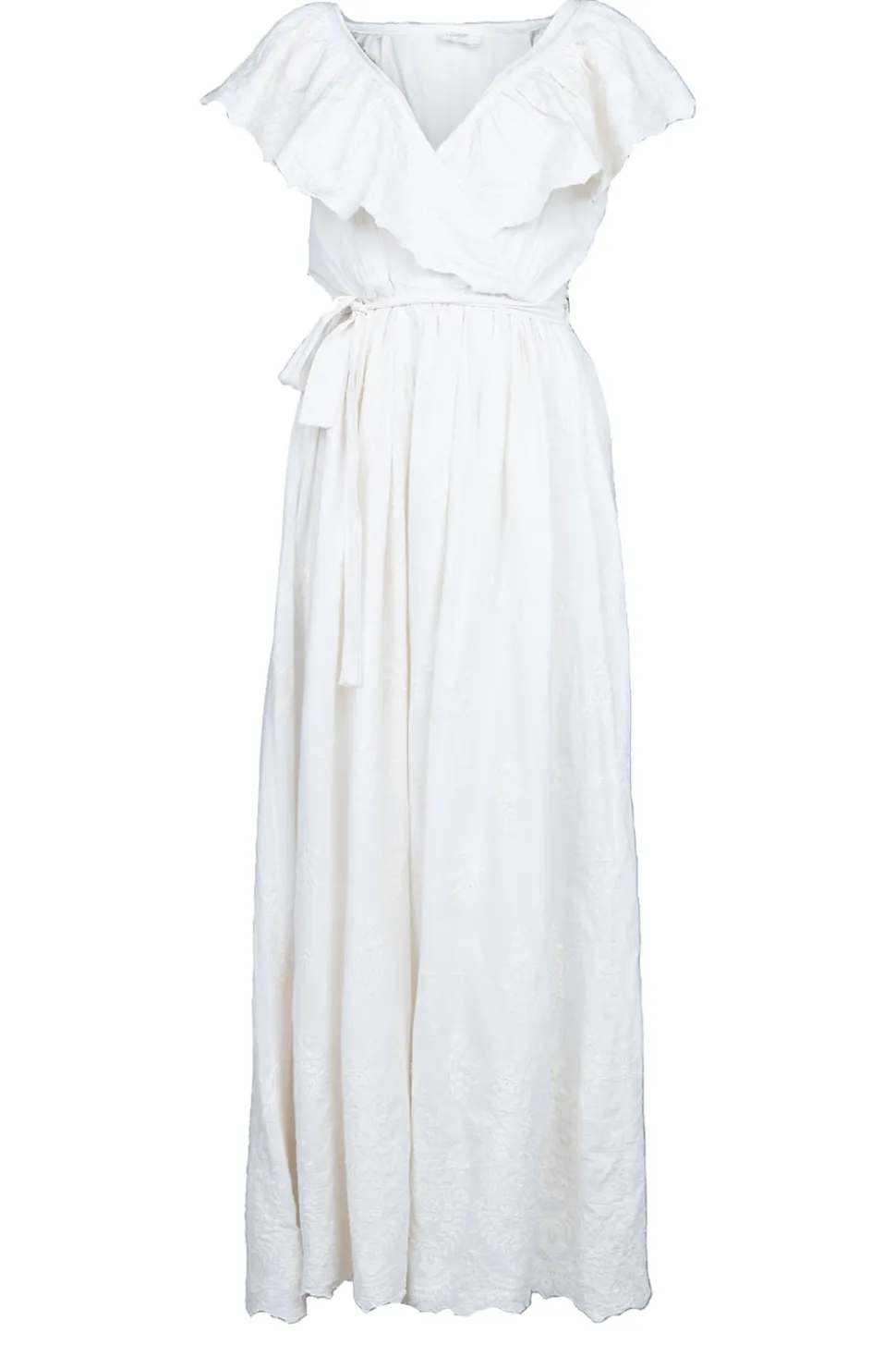 Your New Favorite Dressmaxi Dress With Embroideryv-Neckcap Sleeves With Rufflesbow Belt In Waistcloses With Hidden Zipperregular Fitcomposition100% Cottonwashing Instructionsmachine Wash 30 Degrees