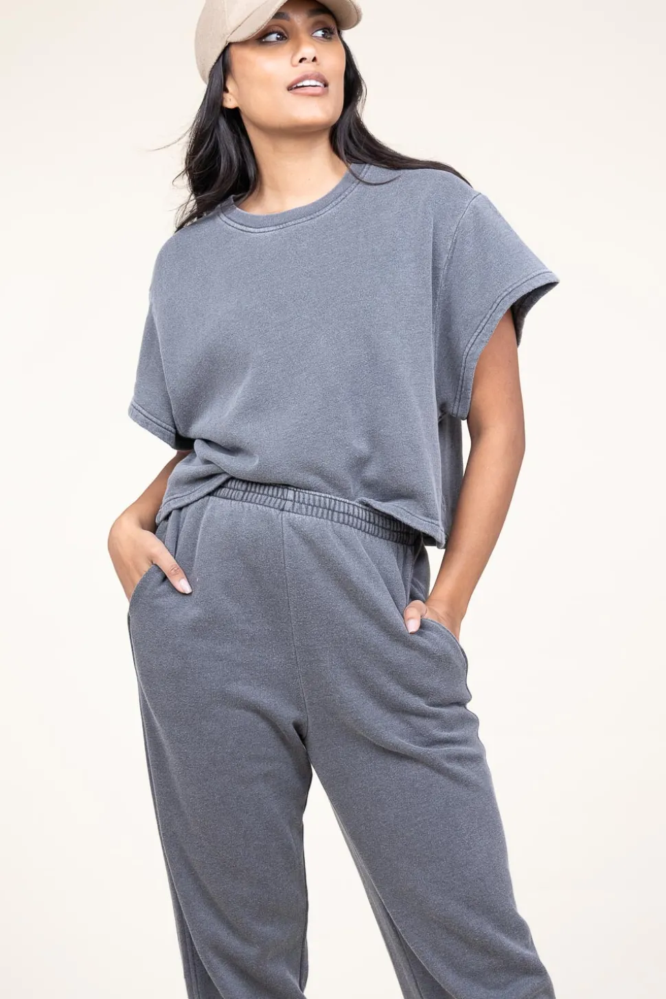 A True Essentialcropped Washed Soft Sweaterround Neckshort Sleevesfleece On Insidepart Of A Matching Setboxy Fitcomposit…