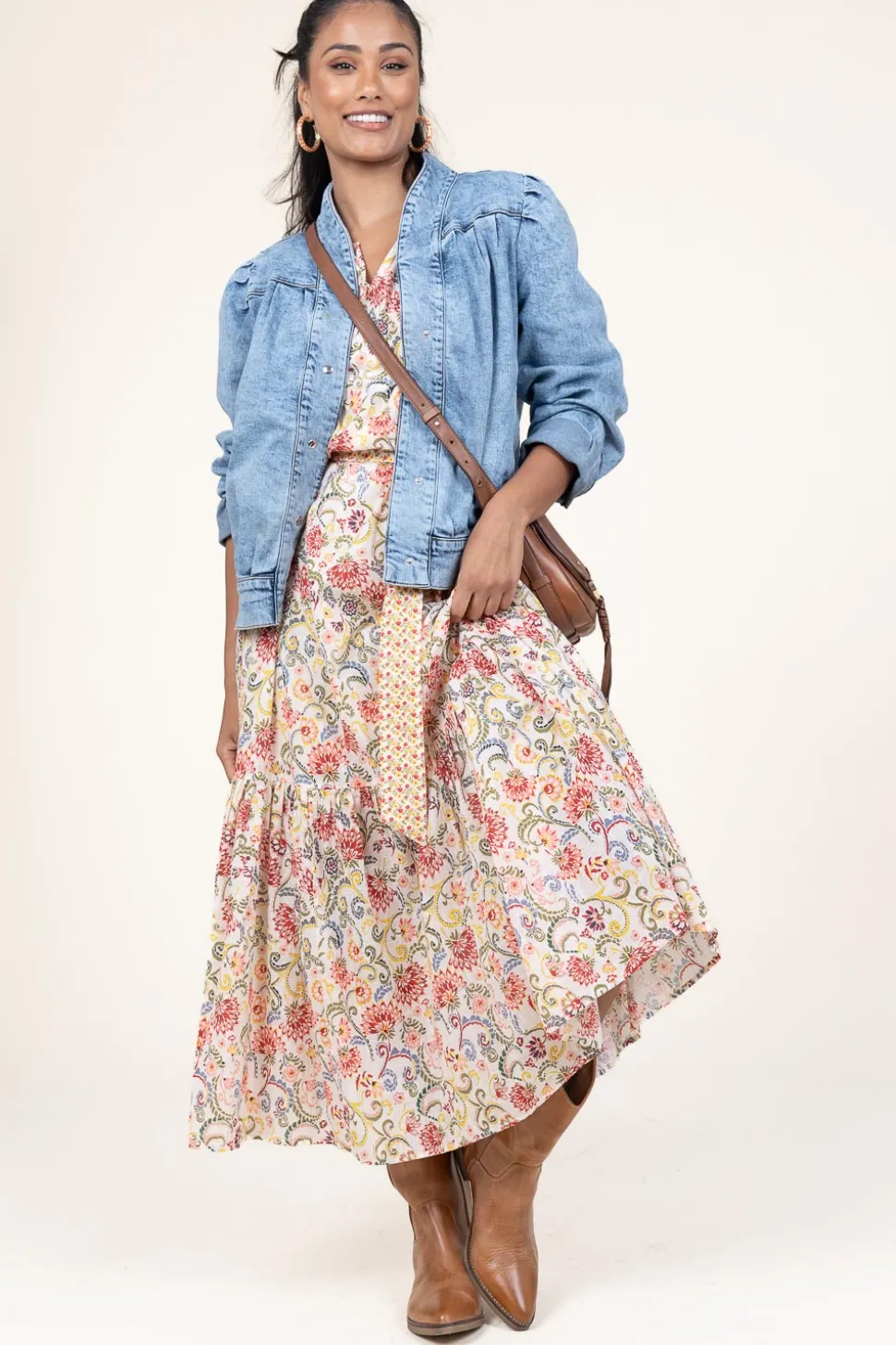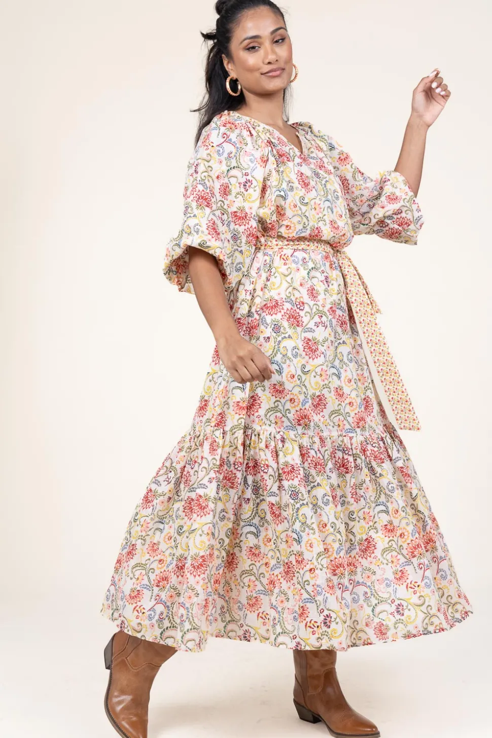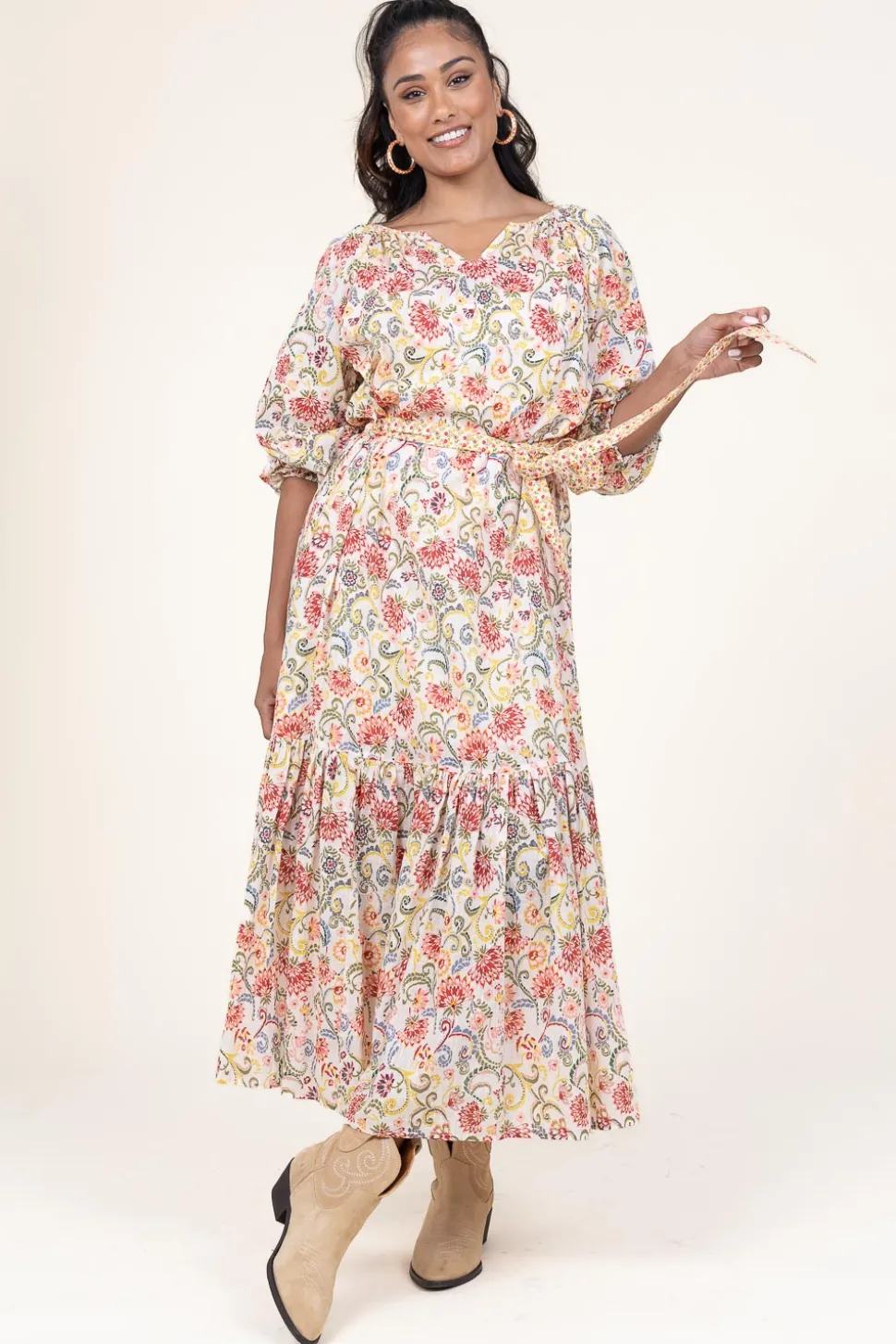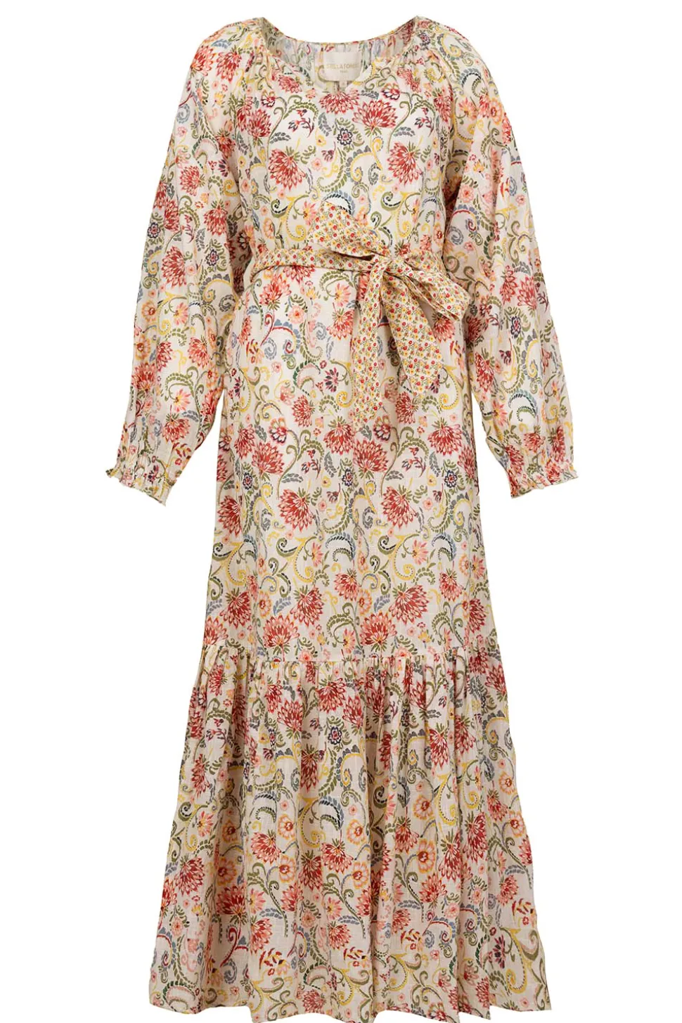 Eyecatcher Alert!Maxi Dress With Printround Neck With V-Necklong Sleeves With Cuffslayered Skirtbow Belt At Waistregular Fitcomposition100% Cottonwashing Instructionsmachine Wash 30 Degrees