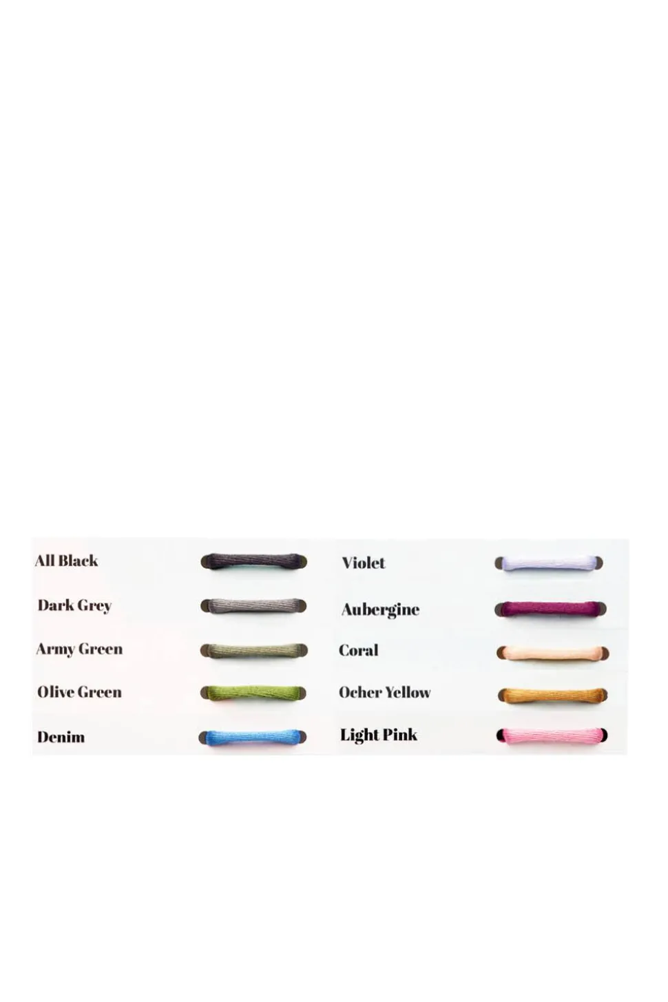 | Maat | all black, army green, aubergine, coral, dark grey, denim, light pink, ocher yellow |