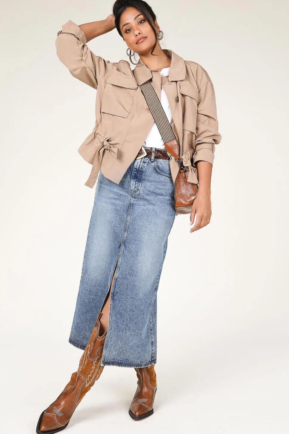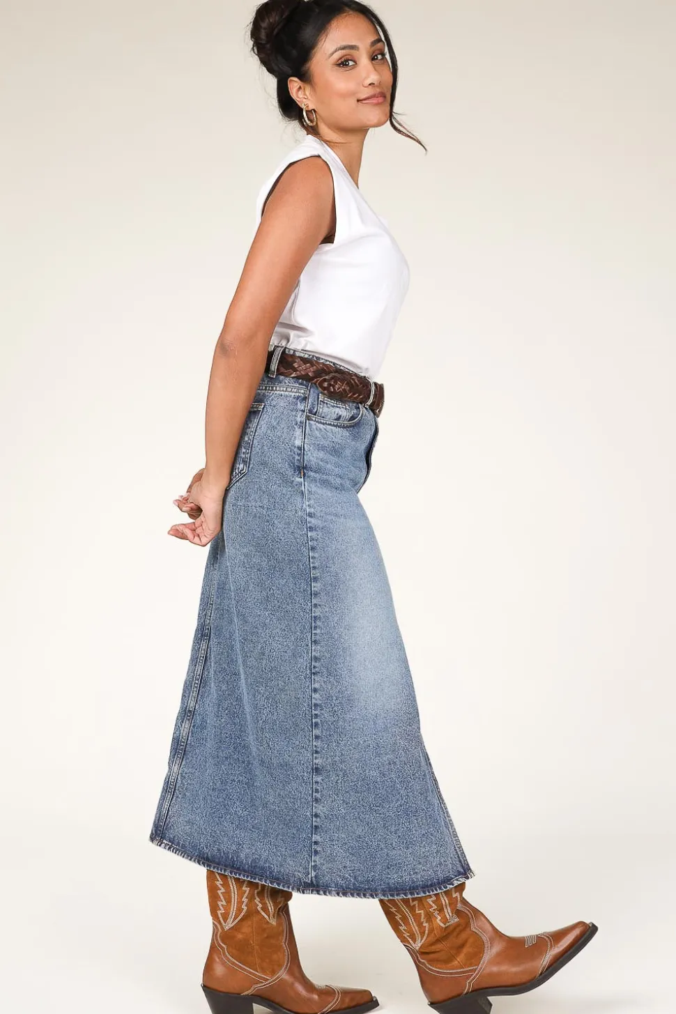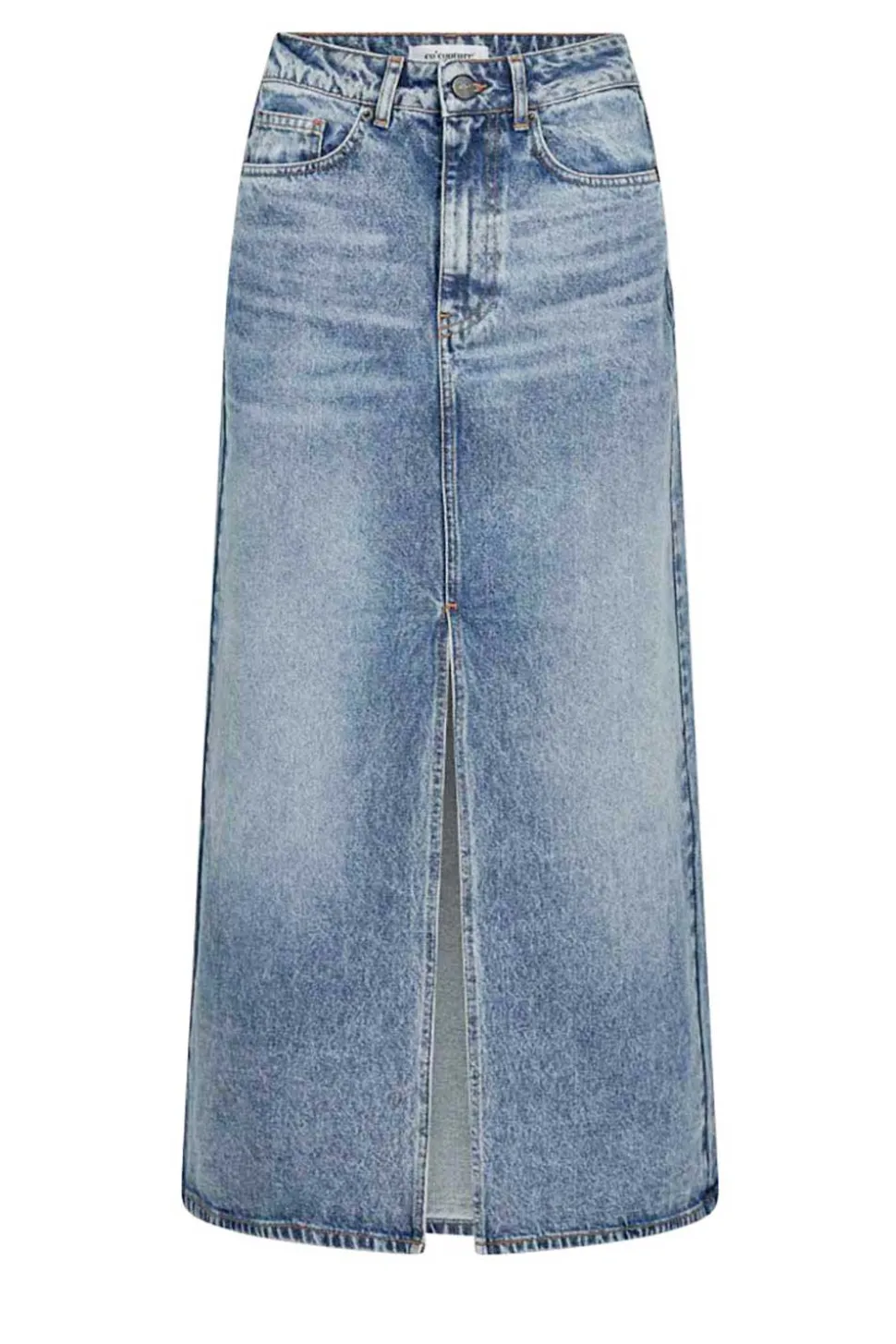 A True Essential Denim Skirt Closes With Button And Hidden Zipper 5-Pocket Model Midi Length Belt Loops Regular Fit Composition 100% Cotton Washing Instructions Machine Wash 40 Degrees