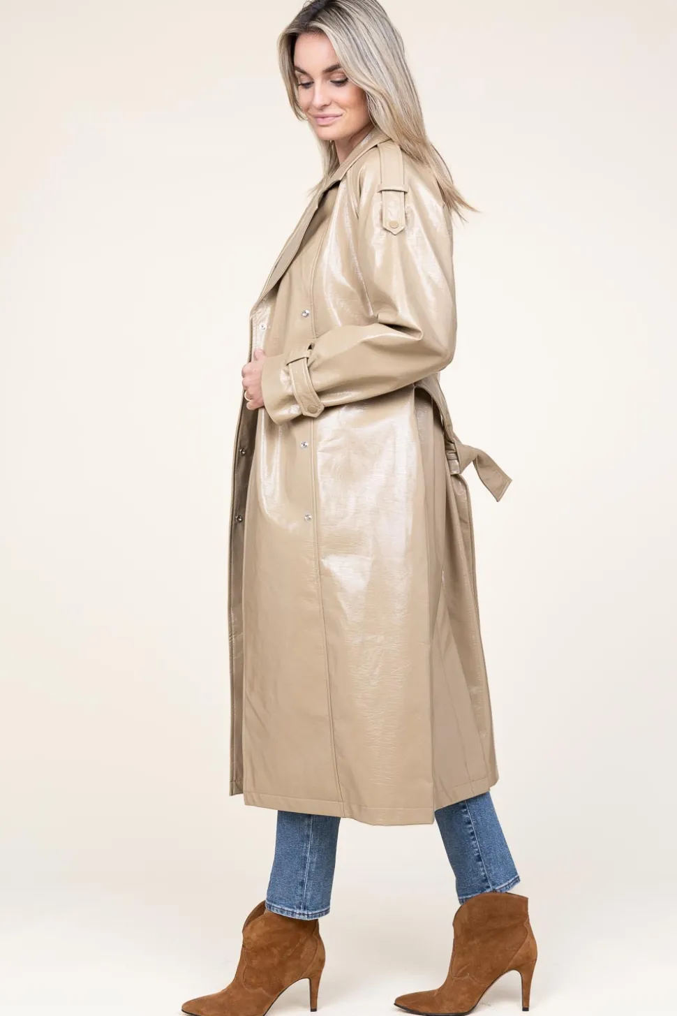 A True Essentiallacquer Trenchcoatlapel Collarlong Sleeves With Cuffstwo Slanted Pocketscloses With Buttonsbow Belt In W…