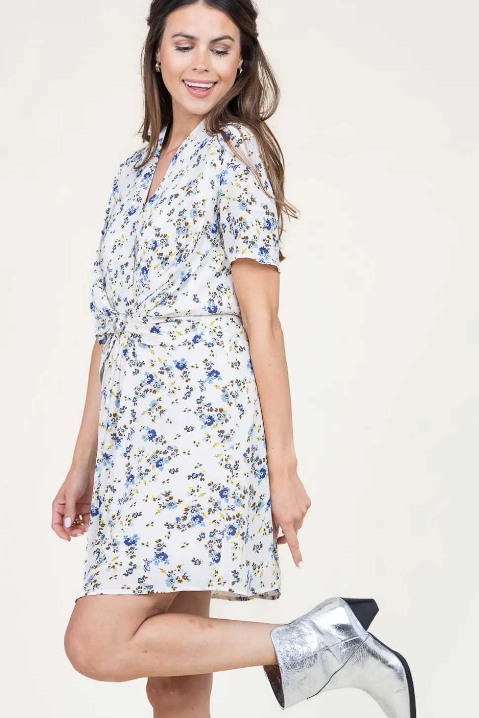 Your New Favorite Dressviscose Dress With Printv-Neckshort Sleevesmini Lengthsmocked- And Silver Colored Detail In Waist…