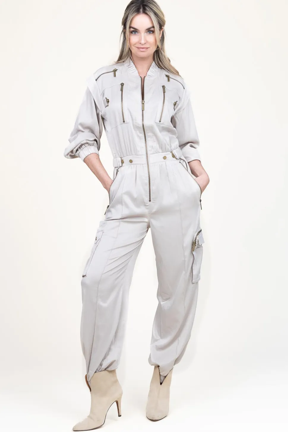 Outfit Stress Wear A Jumpsuit!Satin Cargo Jumpsuitround Necklong Sleeves With Elastic Cuffscloses With Zipperbelt At Wai…