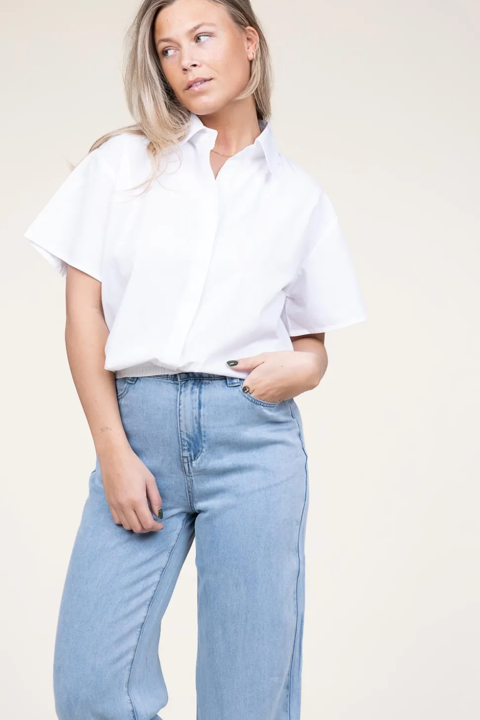 Your New Favorite Blousepoplin Blouseshirt Collarshort Flared Sleeveselastic Waistbandcloses With Buttonsregular Fitcomposition70% Cotton, 30% Polyesterwashing Instructions