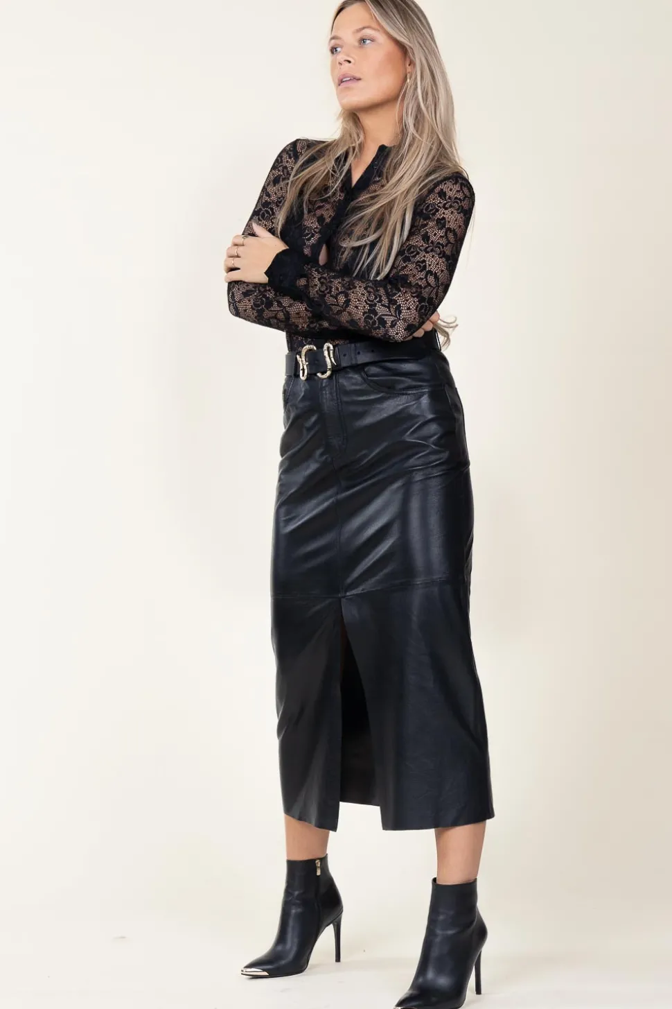 Leather Is Always A Good Idea!Non-Stretch Leather Skirtcloses With Button And Hidden Zipper5-Pocket Modelsplit On The Frontmidi Lengthregular Fitcomposition100% Leatherwashing Instructions&Amp;Nbsp;Special Leather Cleaning