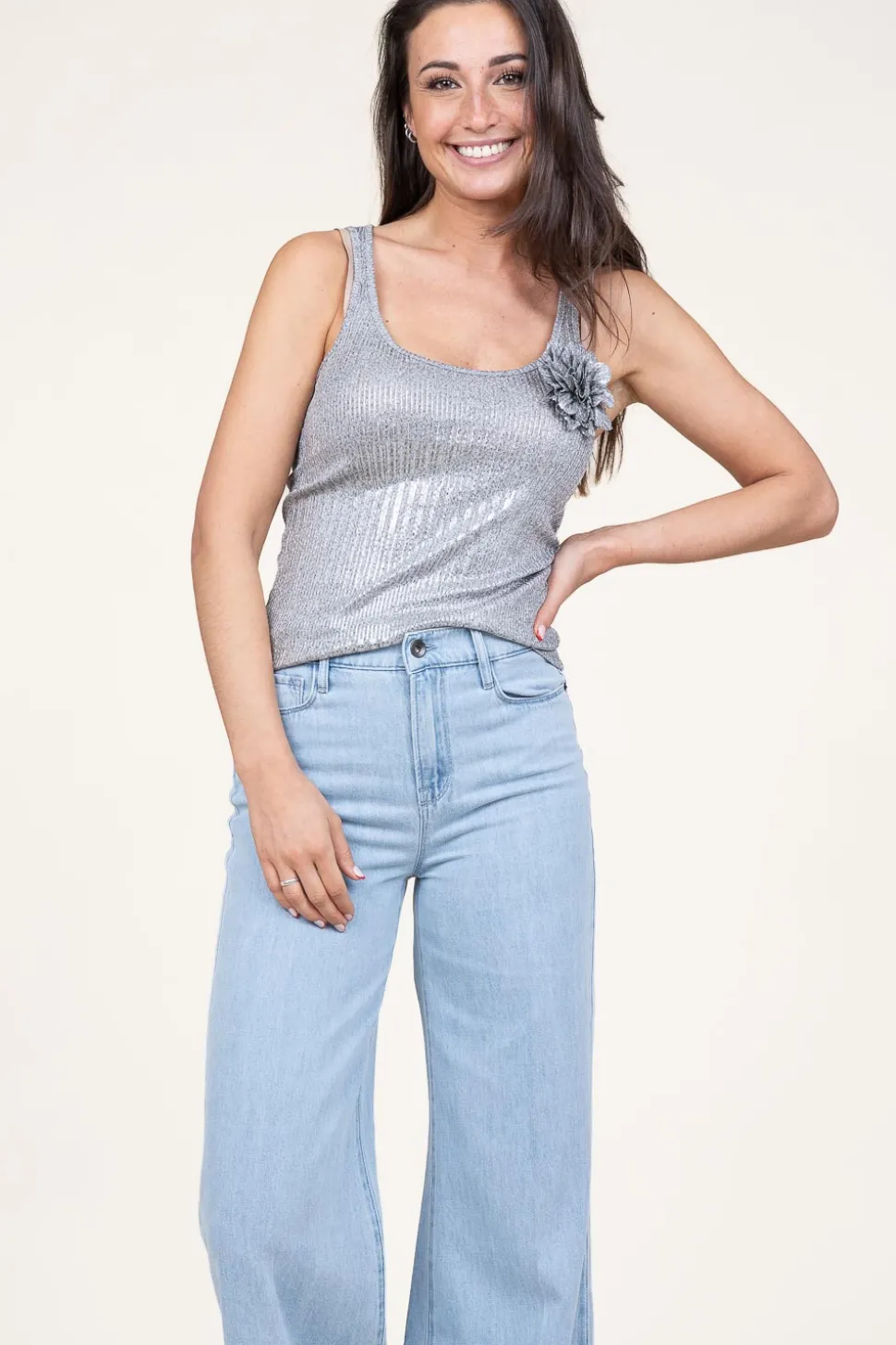 Eyecatcher Alert!Metallic Baby Rib Topround Necksleevelessflower Detail On Frontregular Fitcomposition95% Polyester, 5% …