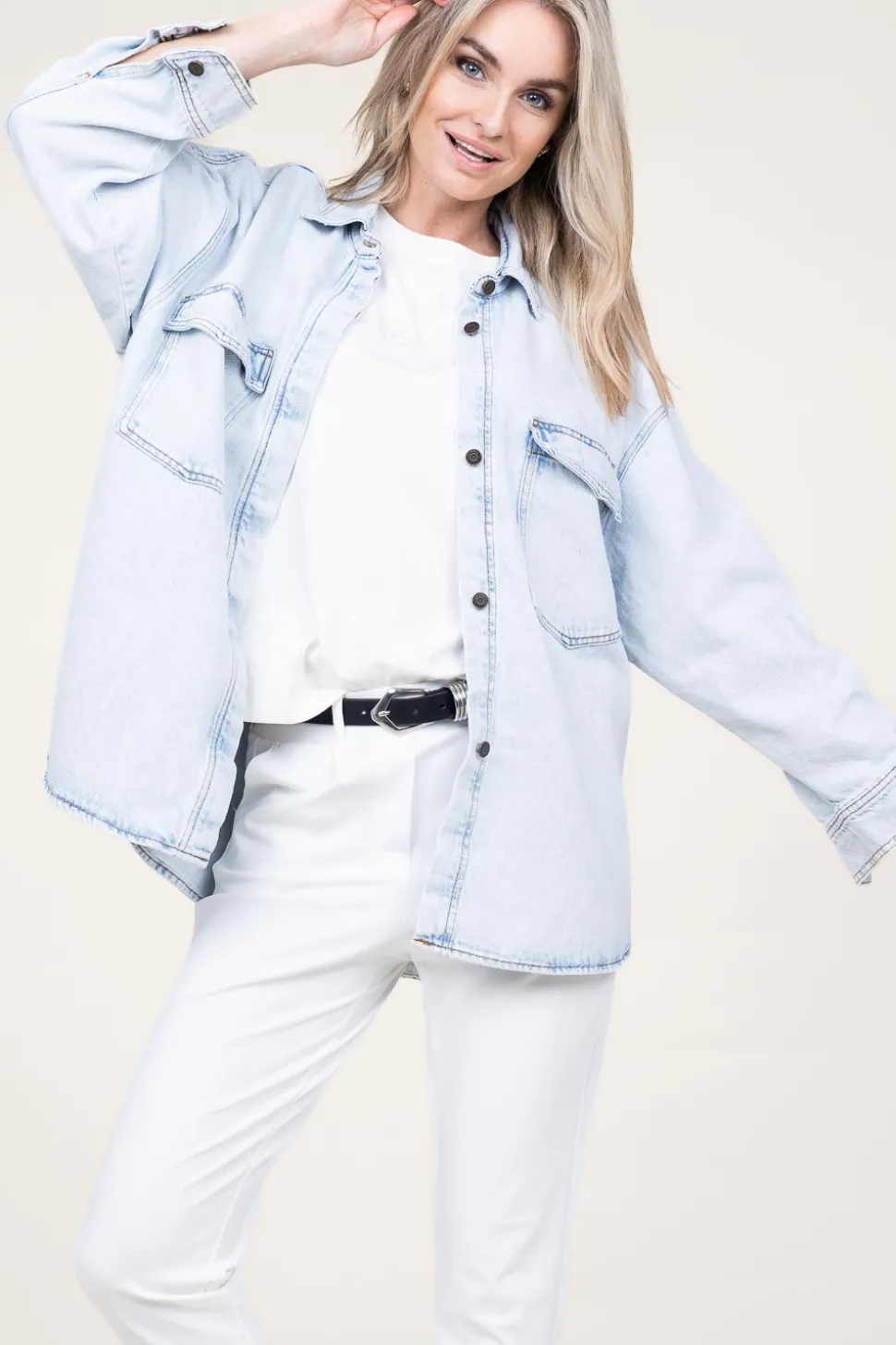 Denim Is Always A Good Idea!Oversized Denim Blouseshirt Collarlong Sleeves With Cuffscloses With Buttonstwo Breast Pocketspart Of A Matching Setoversized Fitcomposition100% Cottonwashing Instructionsmachine Wash 40 Degrees