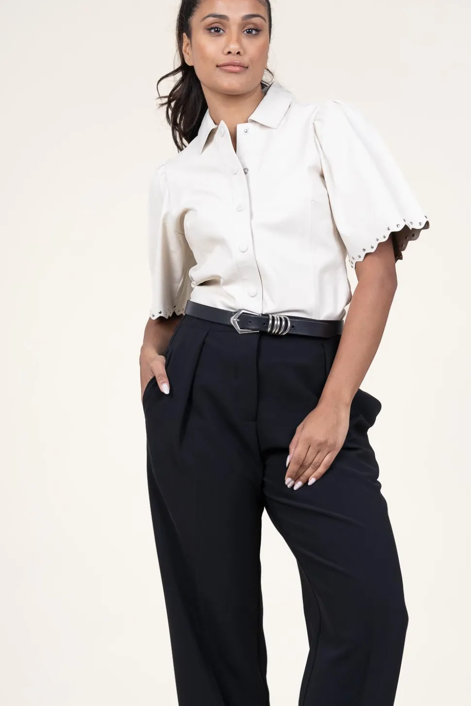 Leather Is Always A Good Idea!Leather Blouse With Studsshirt Collarshort Sleeves With Studsdecorative Seemscloses With B…