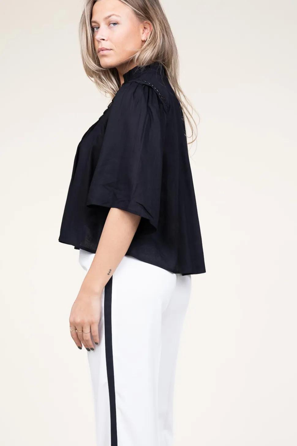 Your New Favorite Blouseopenwork Blouseround Neck With Rufflescloses With Buttonsflared Short Sleevesopenwork And Embroi…