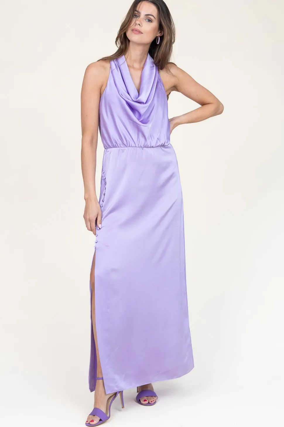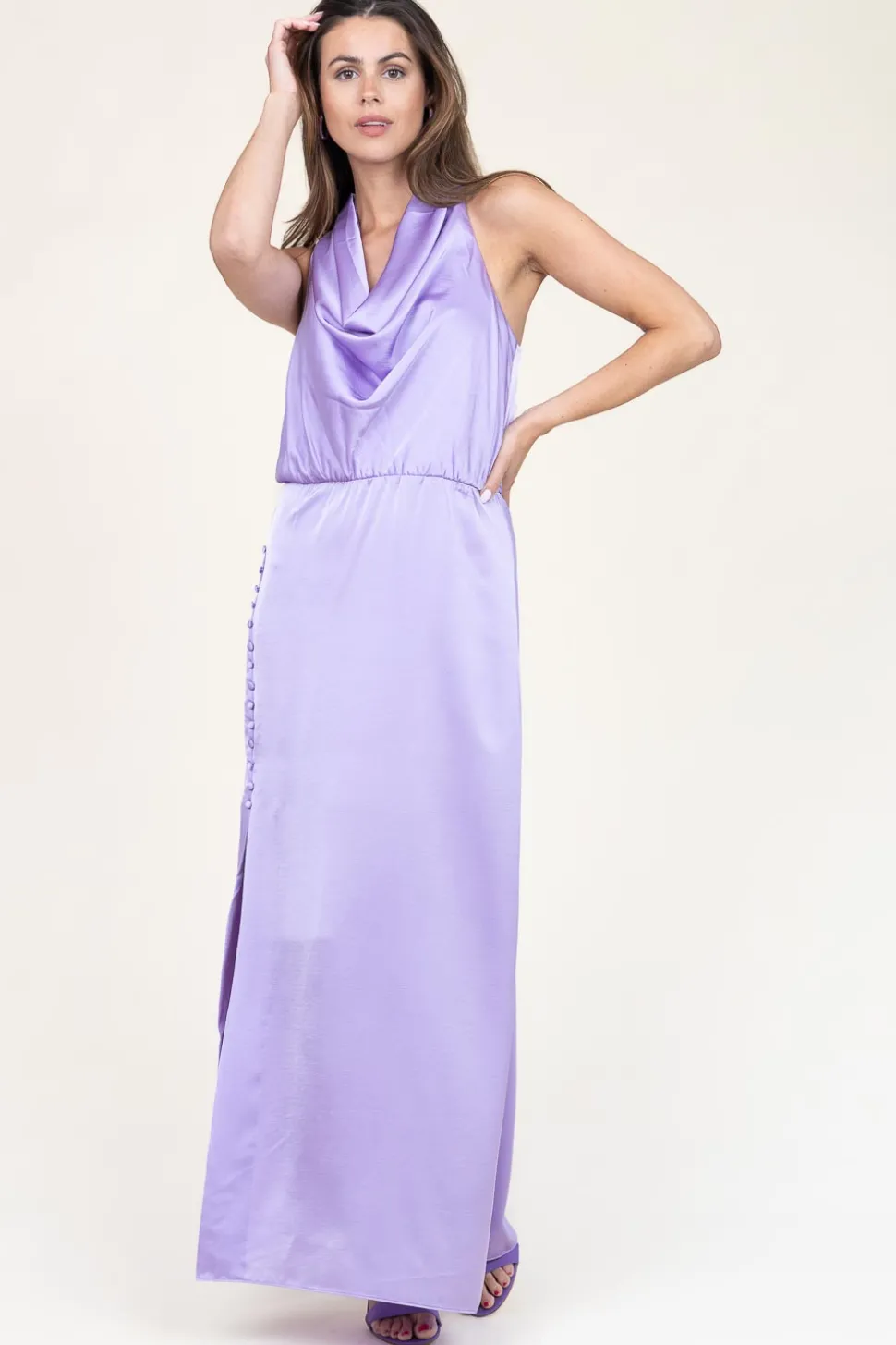 Eyecatcher Alert!Satin Stretch Maxi Dressround Draped Necksleevelessbuttons On The Sidesplit On The Sideopen Back Detailcloses With Buttonslinedregular Fitcomposition51% Recycled Polyester, 49% Polyesterlining: 51% Recycled Polyester, 49% Polyesterwashing Instructionsmachine Wash 30 Degrees