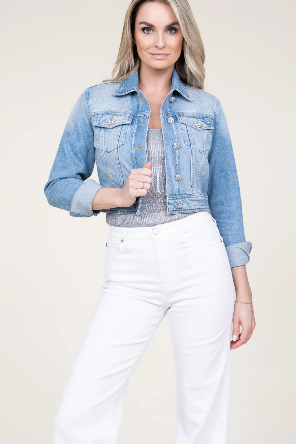 Denim Is Always A Good Idea!Cropped Denim Jacket With Rhinestonesshirt Collarlong Sleeves With Cuffs And Buttonstwo Brea…