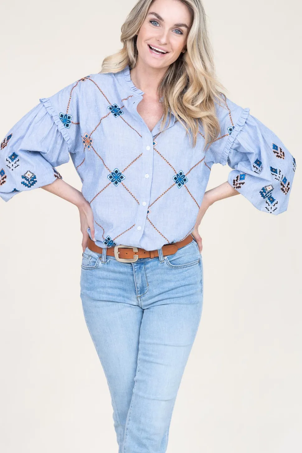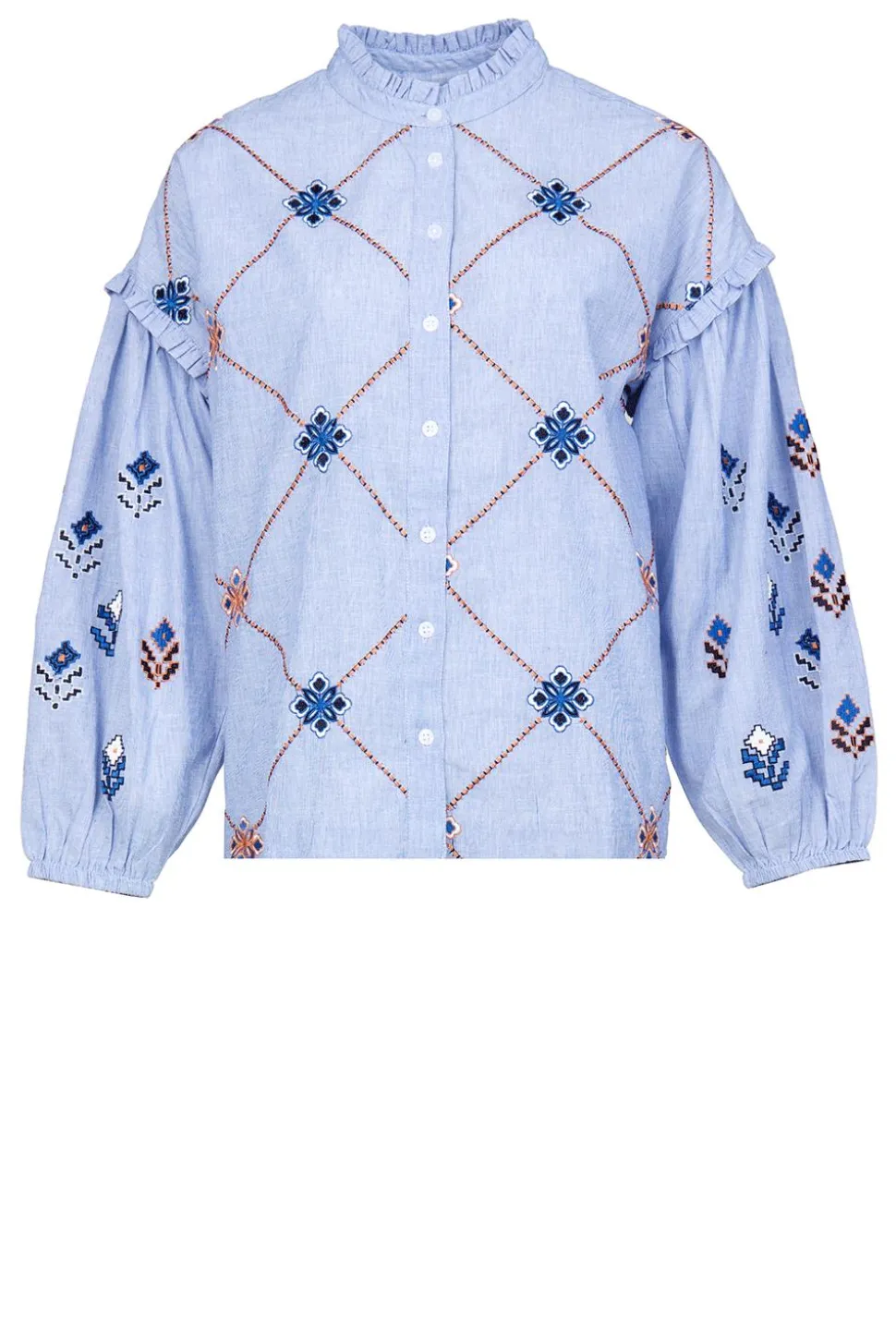 Your New Favorite Blouseblouse With Embroideryround Neck With Ruffleslong Puffed Sleeves With Elastic Cuffscloses With Buttonsruffles At Sleevesregular Fitcomposition
