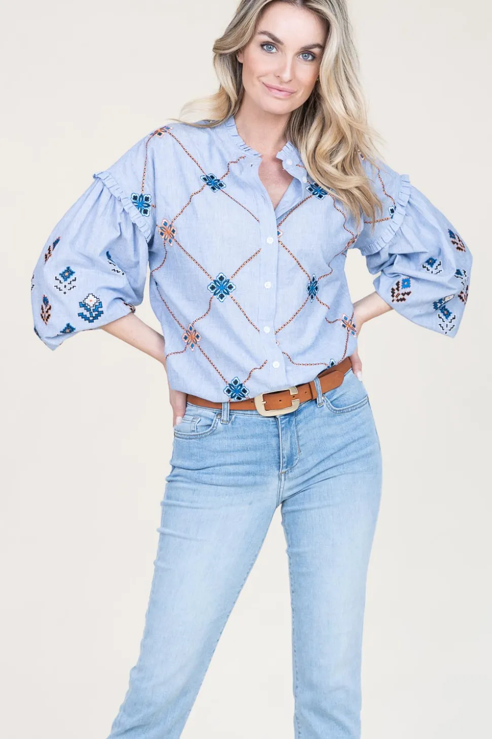 Your New Favorite Blouseblouse With Embroideryround Neck With Ruffleslong Puffed Sleeves With Elastic Cuffscloses With B…