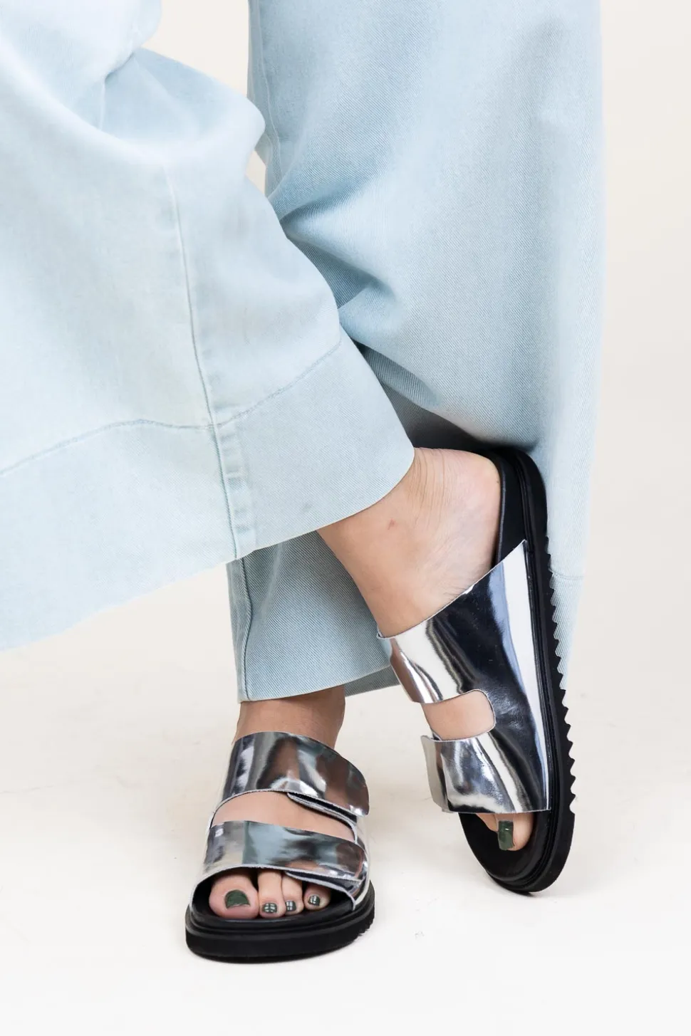 Eyecatcher Alert!Metallic Leather Sandalsadjustable Strapsround Nosechunky Cleated Solescompositionleather